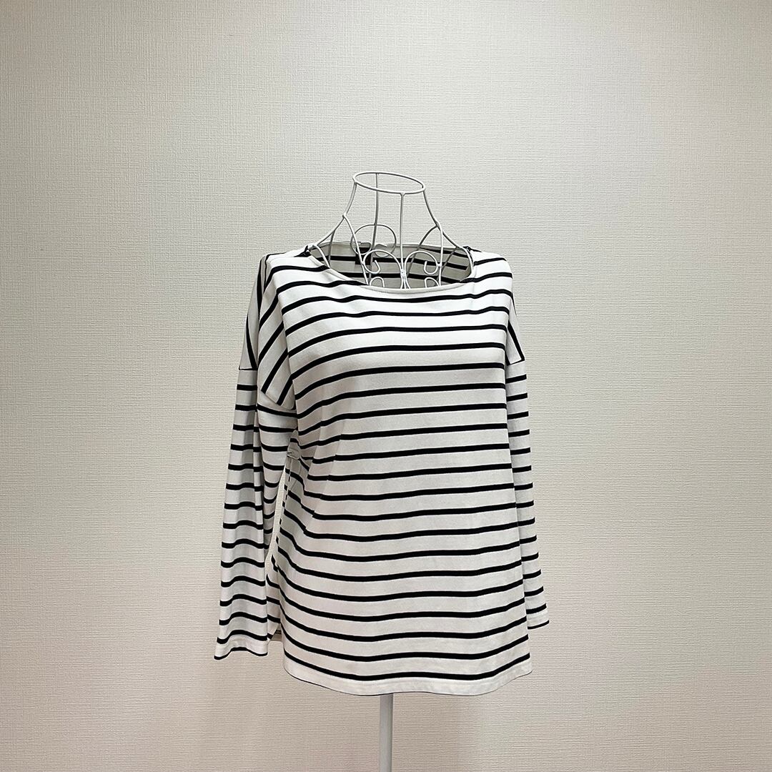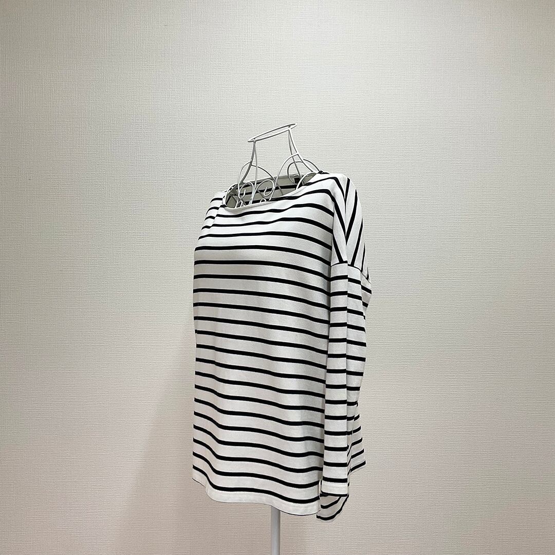 このTシャツは、白と黒のストライプデザインが特徴です。ボートネックスタイルで、カジュアルな印象を与えます。